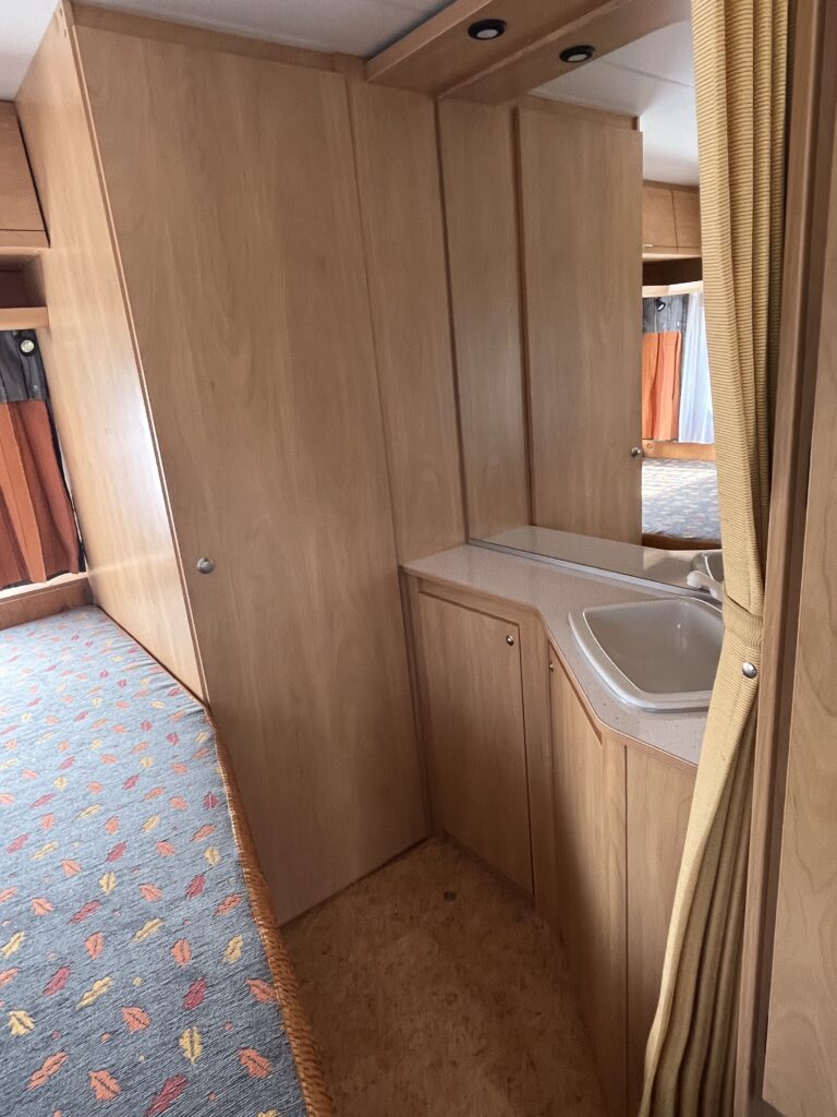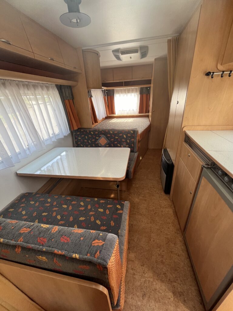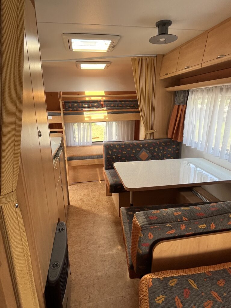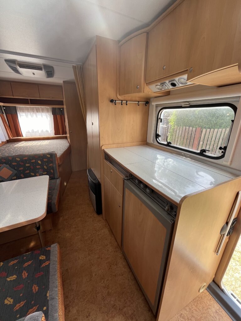 Moderní velký pěkně uspořádaný karavan se spaním pro 6 osob (pohodlně 5 osob) o celkové váze 1380 kg. V přední části dvoulůžko, možné oddělit zástěnou, v zadní části jsou palandy. Ve střední části posezení rozložitelné na dvoulůžko.